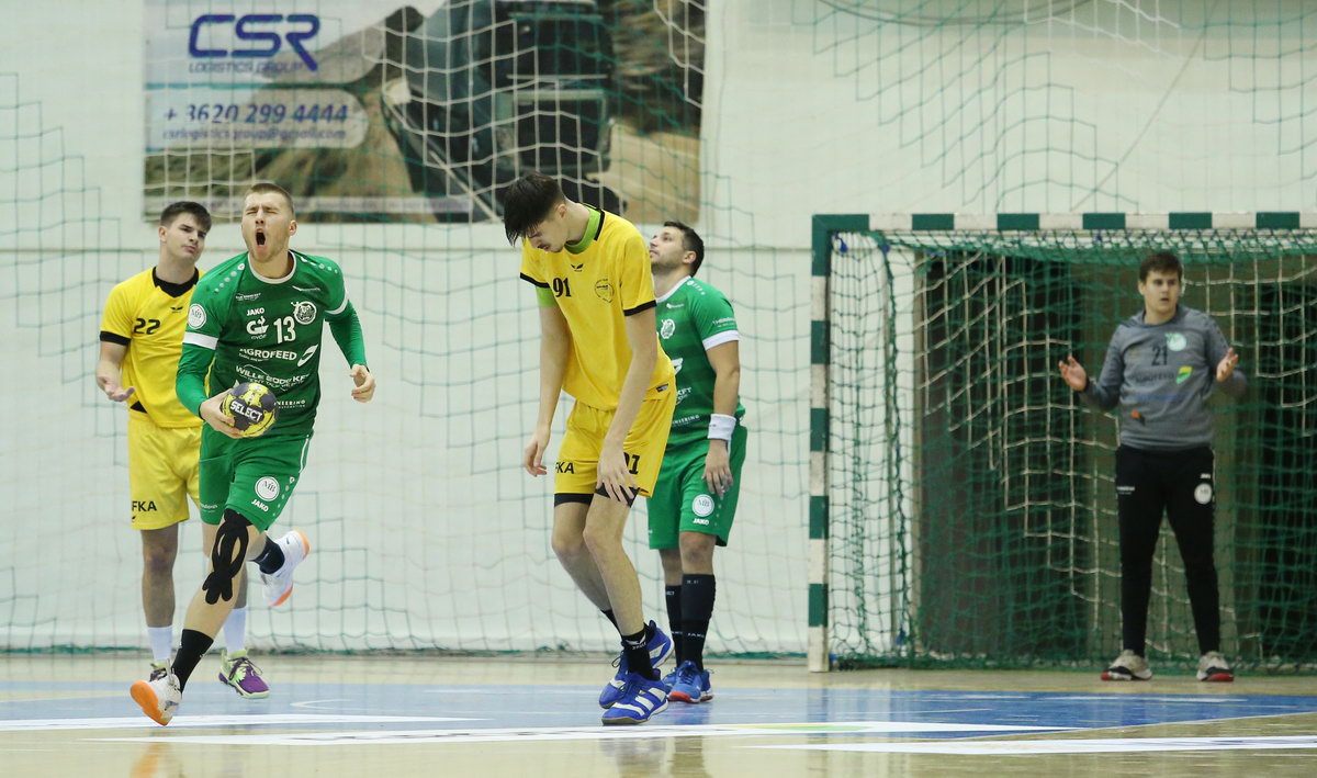 A mérkőzést a Nagy, Győri-Dani, Ásványi, Goór, Lang, Mátés védekező sorral kezdte csapatunk, a kapuban Vargával. A csapatok első találatáig több, mint három percet kellett várnia a szurkolóknak, a vendégek találatára azonban azonnal érkezett Ásványi gyors gólja (4. perc 1-1). A hetedik percben első kiállítását is megkapta Ásványi, ez idő alatt 1-1-es eredményt futottak a csapatok Vargának hála, aki ziccert és átlövést is hárítani tudott (9. perc 3-2). Tovább növeltük előnyünket gyors góljainkkal, Ásványi, Lang és Nagy is eredményesek voltak, így a 13. percben már 7-3-as eredményt mutatott az eredményjelző. Újabb Nagy gólt követően ellenfelünk vezetőedzője ki is használta első időkérési lehetőségét a 15. percben (8-3). A 16. percben Lang is megkapta kettőperces büntetését, így ismét hátrányban játszott csapatunk, de Mátést ez sem zavarta, újabb gólt szerzett csapatunknak (17. perc 10-3). Több mint hét perces gólcsendjét megtörve ellenfelünk megszerezte negyedik találatát, azonban saját térfelükön majdnem minden győri próbálkozásból gól született. A 25. percben Ásványi tudott indulni Varga védését követően, majd Nagy is eredményes tudott lenni indulásból, amivel már tíz gólos előnyünk volt (25. perc 16-6). Az utolsó öt percben Sokoray és Győri-Dani tudtak még gólt szerezni, így a félidei eredmény: 18-9.