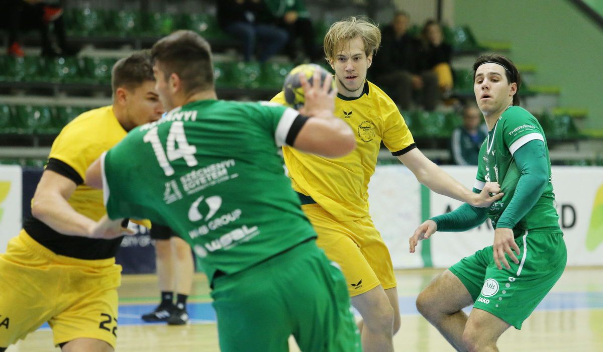 A mérkőzést a Nagy, Győri-Dani, Ásványi, Goór, Lang, Mátés védekező sorral kezdte csapatunk, a kapuban Vargával. A csapatok első találatáig több, mint három percet kellett várnia a szurkolóknak, a vendégek találatára azonban azonnal érkezett Ásványi gyors gólja (4. perc 1-1). A hetedik percben első kiállítását is megkapta Ásványi, ez idő alatt 1-1-es eredményt futottak a csapatok Vargának hála, aki ziccert és átlövést is hárítani tudott (9. perc 3-2). Tovább növeltük előnyünket gyors góljainkkal, Ásványi, Lang és Nagy is eredményesek voltak, így a 13. percben már 7-3-as eredményt mutatott az eredményjelző. Újabb Nagy gólt követően ellenfelünk vezetőedzője ki is használta első időkérési lehetőségét a 15. percben (8-3). A 16. percben Lang is megkapta kettőperces büntetését, így ismét hátrányban játszott csapatunk, de Mátést ez sem zavarta, újabb gólt szerzett csapatunknak (17. perc 10-3). Több mint hét perces gólcsendjét megtörve ellenfelünk megszerezte negyedik találatát, azonban saját térfelükön majdnem minden győri próbálkozásból gól született. A 25. percben Ásványi tudott indulni Varga védését követően, majd Nagy is eredményes tudott lenni indulásból, amivel már tíz gólos előnyünk volt (25. perc 16-6). Az utolsó öt percben Sokoray és Győri-Dani tudtak még gólt szerezni, így a félidei eredmény: 18-9.