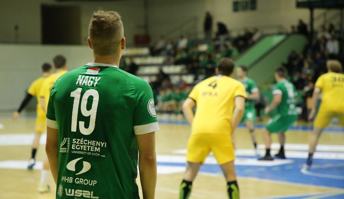 A mérkőzést a Nagy, Győri-Dani, Ásványi, Goór, Lang, Mátés védekező sorral kezdte csapatunk, a kapuban Vargával. A csapatok első találatáig több, mint három percet kellett várnia a szurkolóknak, a vendégek találatára azonban azonnal érkezett Ásványi gyors gólja (4. perc 1-1). A hetedik percben első kiállítását is megkapta Ásványi, ez idő alatt 1-1-es eredményt futottak a csapatok Vargának hála, aki ziccert és átlövést is hárítani tudott (9. perc 3-2). Tovább növeltük előnyünket gyors góljainkkal, Ásványi, Lang és Nagy is eredményesek voltak, így a 13. percben már 7-3-as eredményt mutatott az eredményjelző. Újabb Nagy gólt követően ellenfelünk vezetőedzője ki is használta első időkérési lehetőségét a 15. percben (8-3). A 16. percben Lang is megkapta kettőperces büntetését, így ismét hátrányban játszott csapatunk, de Mátést ez sem zavarta, újabb gólt szerzett csapatunknak (17. perc 10-3). Több mint hét perces gólcsendjét megtörve ellenfelünk megszerezte negyedik találatát, azonban saját térfelükön majdnem minden győri próbálkozásból gól született. A 25. percben Ásványi tudott indulni Varga védését követően, majd Nagy is eredményes tudott lenni indulásból, amivel már tíz gólos előnyünk volt (25. perc 16-6). Az utolsó öt percben Sokoray és Győri-Dani tudtak még gólt szerezni, így a félidei eredmény: 18-9.
