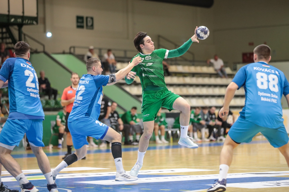 A mérkőzést a Paár, Lang, Mátés, Rosta, Sövegjártó, Nagy sorral kezdte csapatunk, a kapuban Vargával. Az első találatot a vendégek szerezték, melyre a harmadik percben érkezett Nagy válasza is (1-1). Rosta üres kapus góljával a negyedik percben 2-4-es állást mutatott az eredményjelző, Mátés találatával pedig 3-4-re zárkóztunk. A vendégek 7-6 elleni játéka nem sokáig volt eredményes, hiszen a tizedik percben emberelőnyben Paár góljával magunkhoz is ragadtuk a vezetést (5-4). A tizenkettedik percben Rosta szabálytalanságát követően először kerültünk emberhátrányba, de gyorsan egyenlő lett a létszám miután a vendégek összeszedtek egy kiállítást. A 15. percben 9-6-ra módosította Paár az eredményt, aki szintén üres kapura lőhetett. Nagy gyors indulásból szerzett góljával először vezetett csapatunk négy találattal (10-6), majd Sokoray első góljával tartottuk is az előnyt (11-7). Első hétméteresből szerzett találatunkat Mátés szerezte a 21. percben, a következő percben azonban kettőperces kiállítást kapott, így ismét hátrányban kellett játszanunk (13-10). Újabb kiállításunkat Ásványi kapta a 24. percben, melyet követően vezetőedzőnk időt is kért a mérkőzés során először, 13-12-es állásnál. A 25. percben 13-13-ra szépített a Békés, de Sokoray passzát követően Paár találatával ismét nálunk volt a vezetés (26. perc 14-13). Rögtön érkezett is a vendégek időkérése, de a félidő lefújásáig már nem tudtak gólt szerezni, a mi oldalunkon viszont Mátés kétszer is eredményes volt, így a félidei eredmény: 16-13.