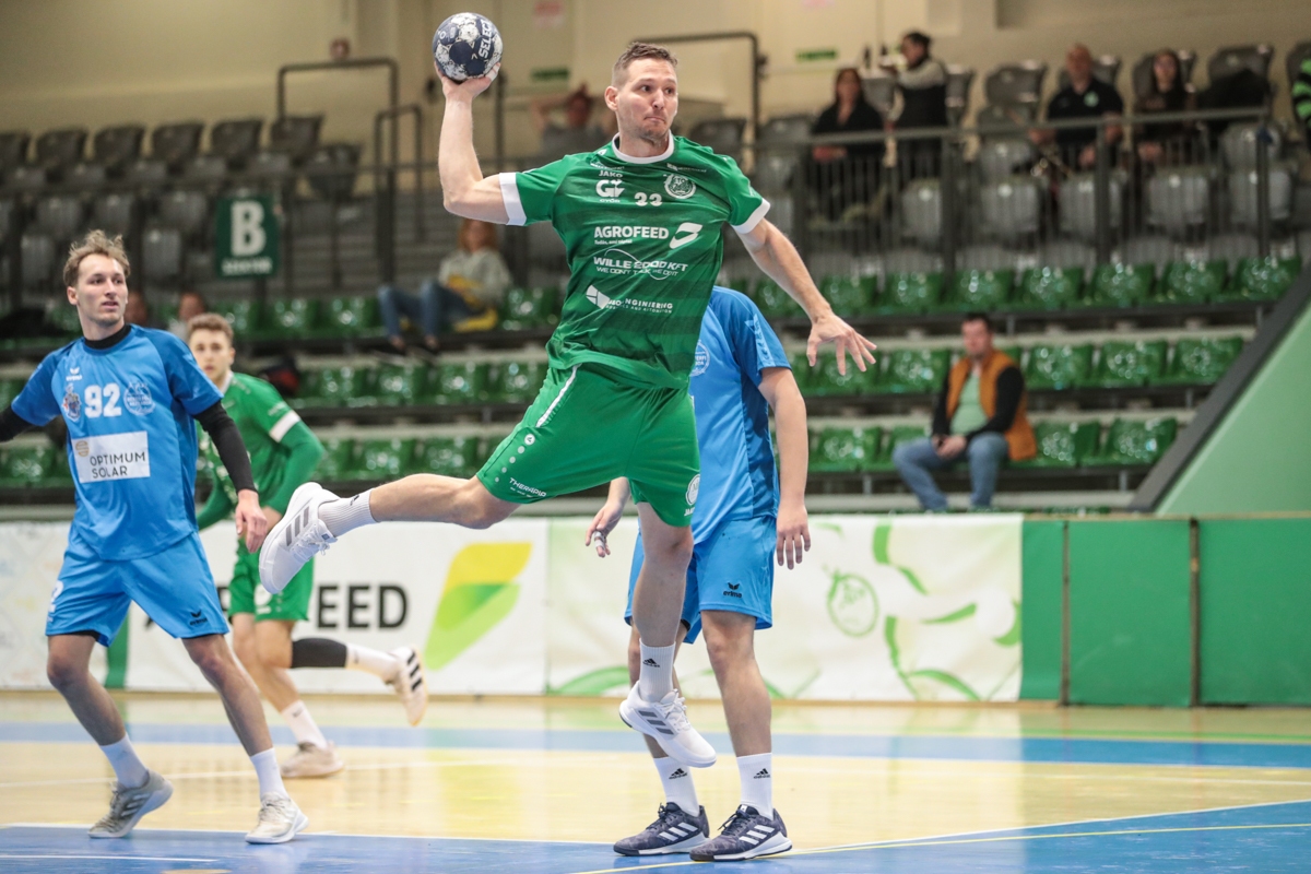 A mérkőzést a Paár, Lang, Mátés, Rosta, Sövegjártó, Nagy sorral kezdte csapatunk, a kapuban Vargával. Az első találatot a vendégek szerezték, melyre a harmadik percben érkezett Nagy válasza is (1-1). Rosta üres kapus góljával a negyedik percben 2-4-es állást mutatott az eredményjelző, Mátés találatával pedig 3-4-re zárkóztunk. A vendégek 7-6 elleni játéka nem sokáig volt eredményes, hiszen a tizedik percben emberelőnyben Paár góljával magunkhoz is ragadtuk a vezetést (5-4). A tizenkettedik percben Rosta szabálytalanságát követően először kerültünk emberhátrányba, de gyorsan egyenlő lett a létszám miután a vendégek összeszedtek egy kiállítást. A 15. percben 9-6-ra módosította Paár az eredményt, aki szintén üres kapura lőhetett. Nagy gyors indulásból szerzett góljával először vezetett csapatunk négy találattal (10-6), majd Sokoray első góljával tartottuk is az előnyt (11-7). Első hétméteresből szerzett találatunkat Mátés szerezte a 21. percben, a következő percben azonban kettőperces kiállítást kapott, így ismét hátrányban kellett játszanunk (13-10). Újabb kiállításunkat Ásványi kapta a 24. percben, melyet követően vezetőedzőnk időt is kért a mérkőzés során először, 13-12-es állásnál. A 25. percben 13-13-ra szépített a Békés, de Sokoray passzát követően Paár találatával ismét nálunk volt a vezetés (26. perc 14-13). Rögtön érkezett is a vendégek időkérése, de a félidő lefújásáig már nem tudtak gólt szerezni, a mi oldalunkon viszont Mátés kétszer is eredményes volt, így a félidei eredmény: 16-13.